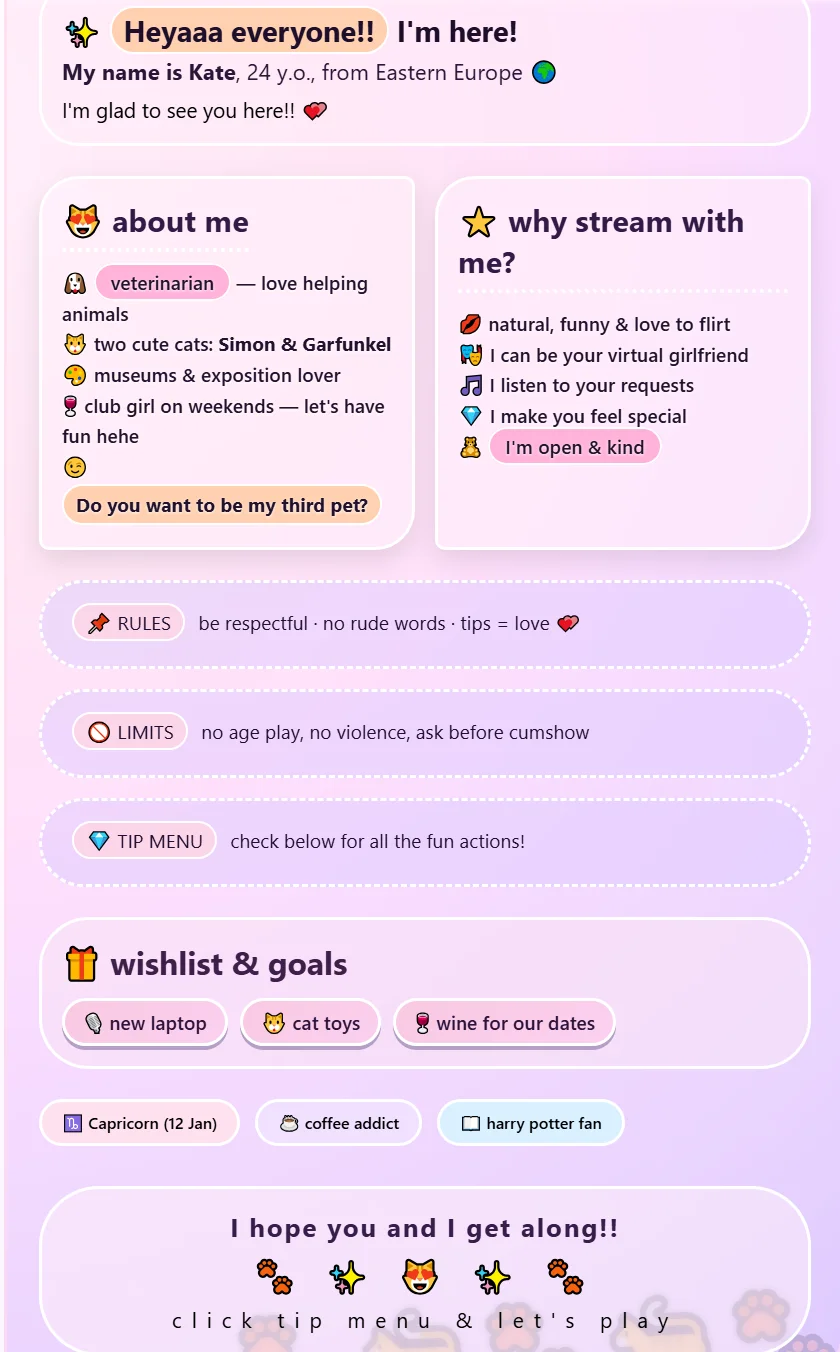 อาเฮะกาโอะ, คุยเรื่องลามก, แนะนำการช่วยตัวเอง, เฟติชเท้า, เซ็กส์ทอย, เต้นยั่ว, ตีก้น, ทำให้อับอาย, เปลือยอก, ทเวิร์ก, ระบำเปลื้องผ้า, โรลเพลย์, การให้คะแนนเจ้าโลก, นวด, ช่วยตัวเอง, ใช้นิ้ว, วับๆ แวมๆ, ใช้มือ